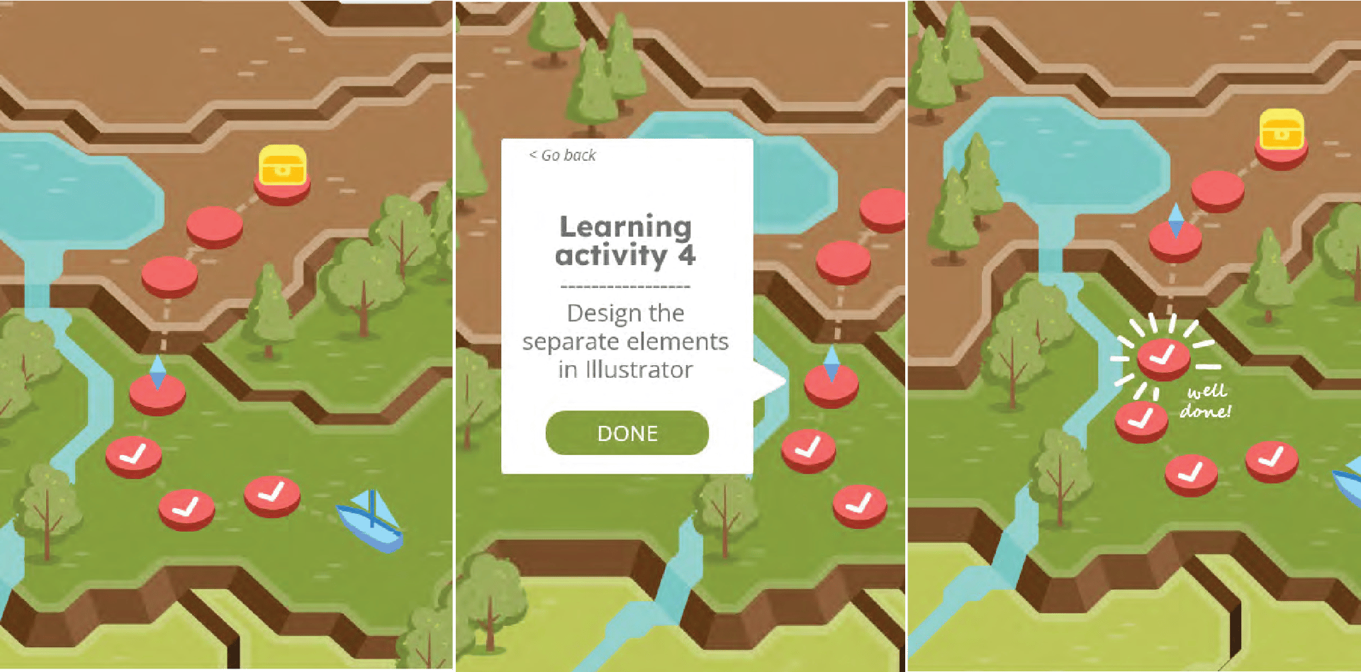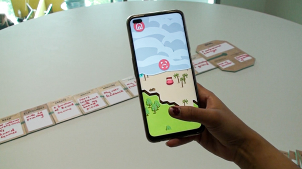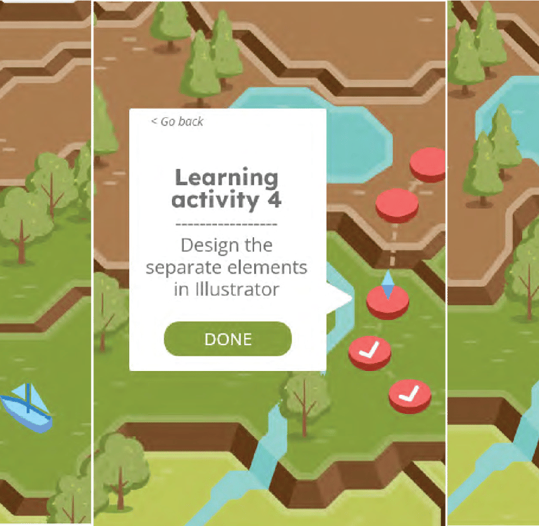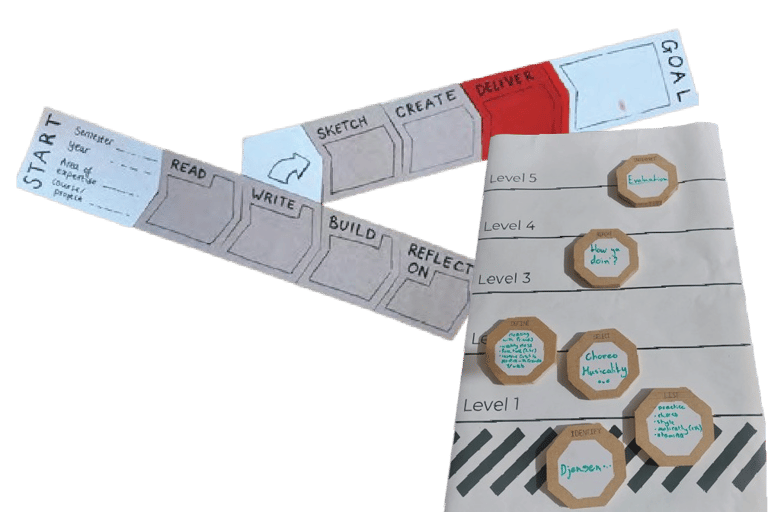Followed a structured user-centered process (empathize with users, define problems, brainstorm ideas, prototype, test). Iteration 1 tested physical learning path tiles with a simple digital companion. Iteration 2 added a mountain-map interface with game challenges based on learning taxonomies.