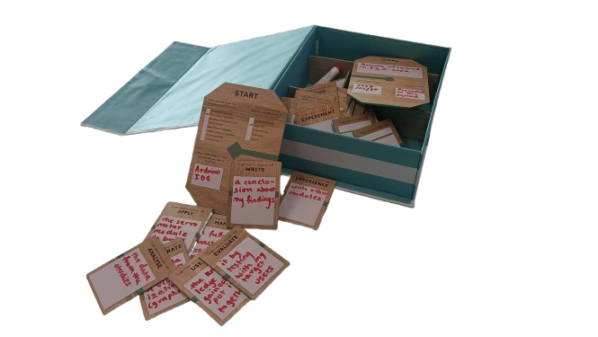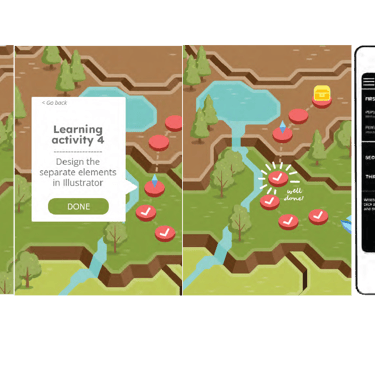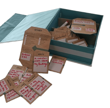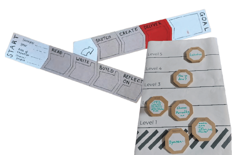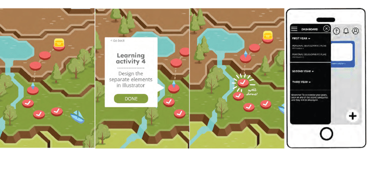 Followed a structured user-centered process (empathize with users, define problems, brainstorm ideas, prototype, test). Iteration 1 tested physical learning path tiles with a simple digital companion. Iteration 2 added a mountain-map interface with game challenges based on learning taxonomies. Iteration 3 refined to modular verb tiles ("To get closer to my goal I will...") scanned into a playful app with progressive reveals, reflection prompts, and time challenges.