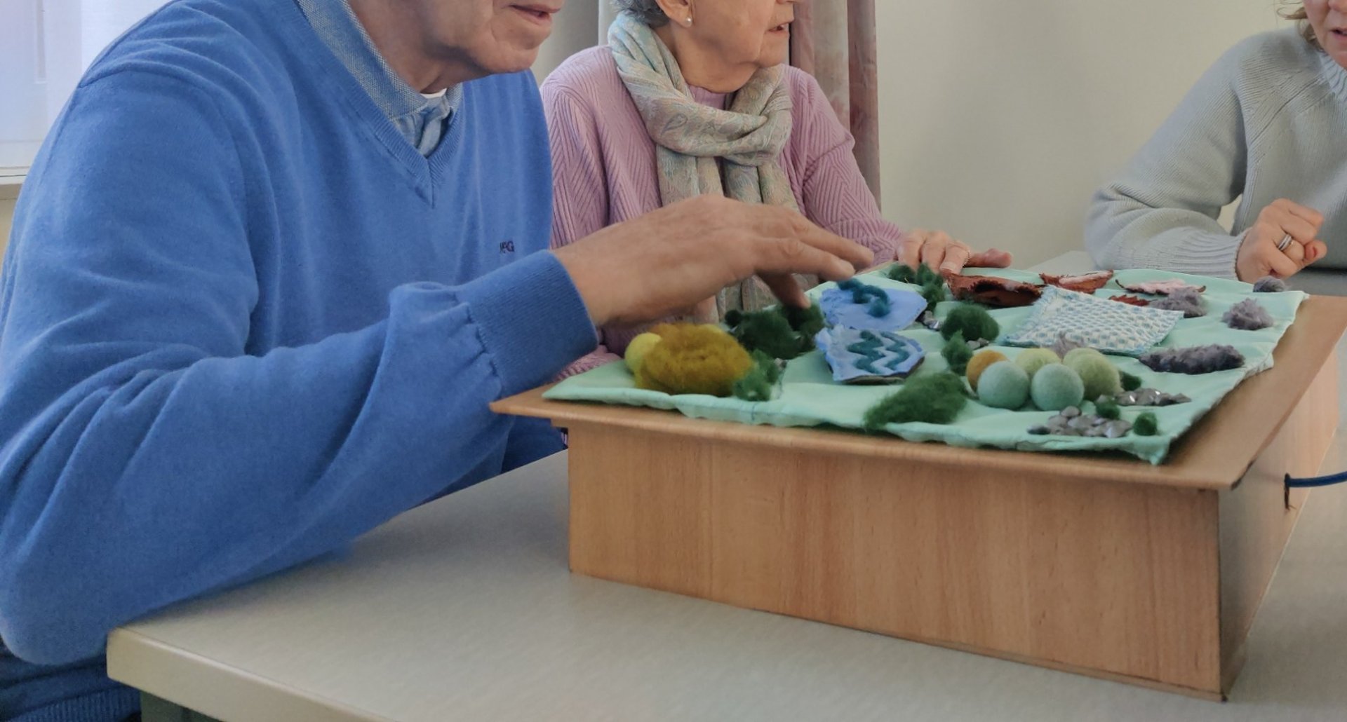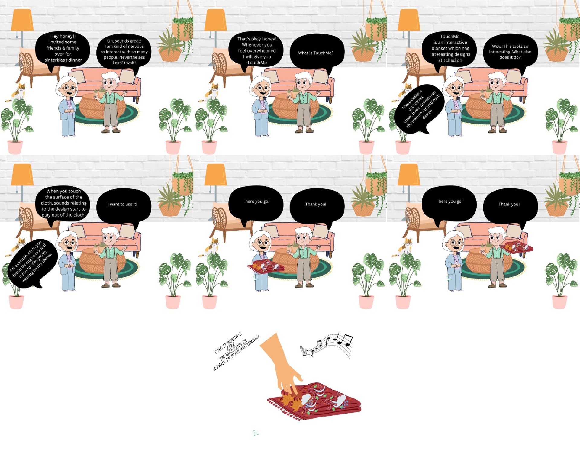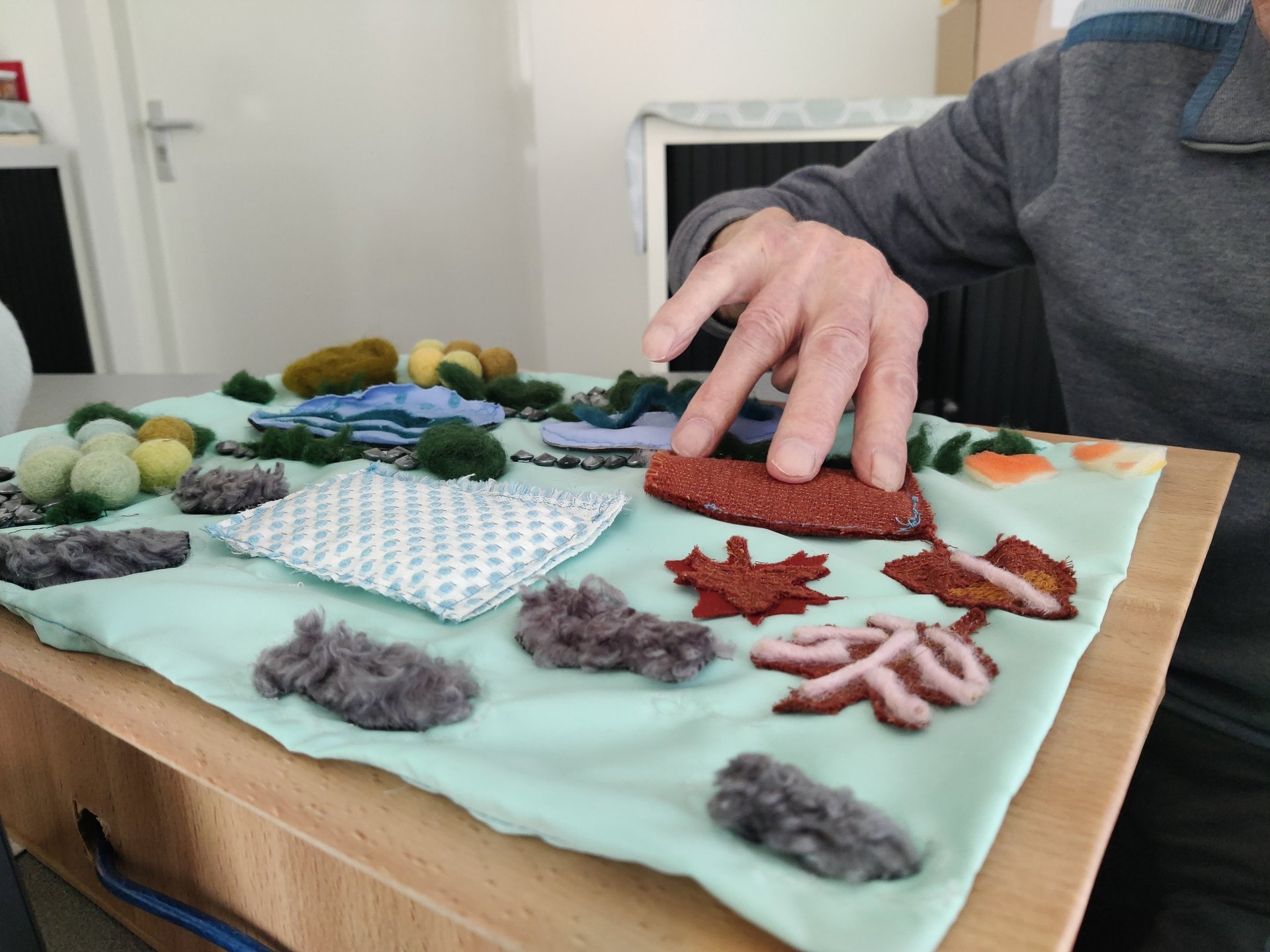 TouchME is an interactive textile designed to offer people with dementia a flexible, tangible, multi-sensory interface to touch, squeeze, and explore. It combines varied nature-inspired textures with sound to invite gentle fidgeting and interaction in everyday, familiar spaces.